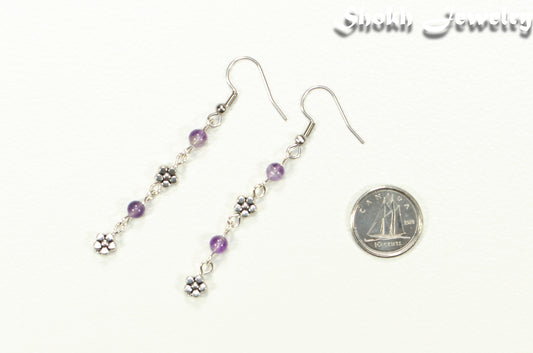 Long Amethyst and Flower Earrings, February Birthstone Jewelry