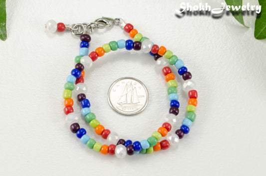 White Glass Crystal and Rainbow Seed Bead Anklet
