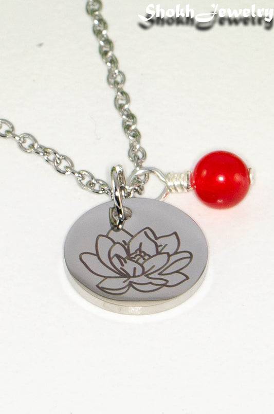 July Birth Flower Necklace with Red Ruby Birthstone Pendant