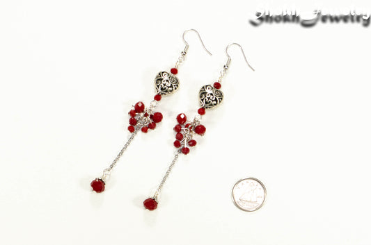 Statement Tibetan Silver Heart and Red Beaded Cluster Earrings