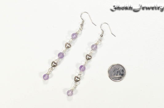 Long Amethyst and Heart Earrings, February Birthstone Jewelry