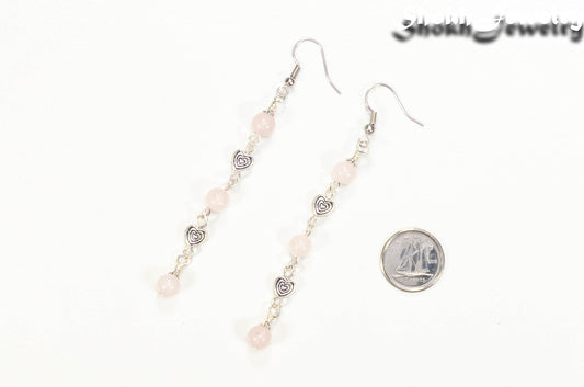 Long Rose Quartz and Heart Earrings