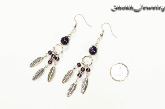 Long Stainless Steel Chain and Amethyst Earrings, February Birthstone Jewelry