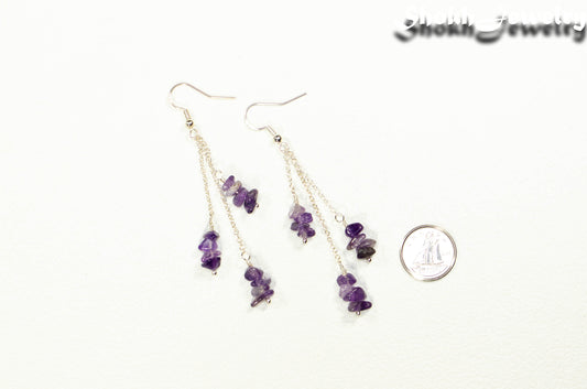 Long Silver Plated Chain and Amethyst Crystal Chip Earrings, February Birthstone Jewelry