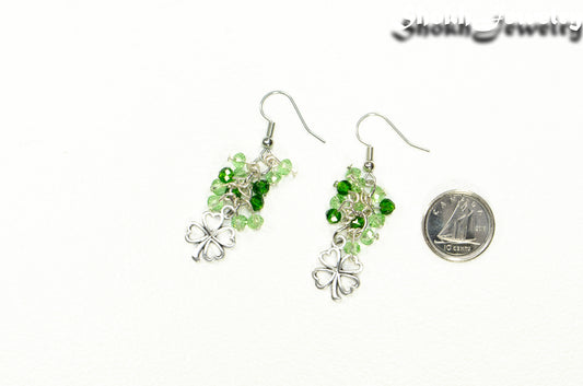 Lucky Four Leaf Clover Charm and Green Glass Bead Earrings