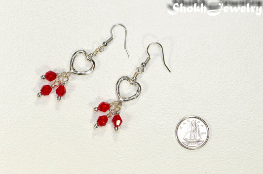 Silver Plated Heart and Red Glass Crystal Cluster Earrings