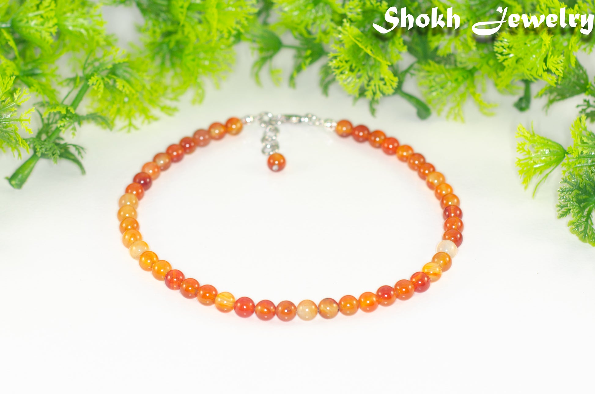 This gorgeous choker necklace is handmade with 6mm carnelian crystal beads strung on sturdy bead stringing wire, finished with a lobster clasp and 0.5-inch extender chain and a cute little dangle.