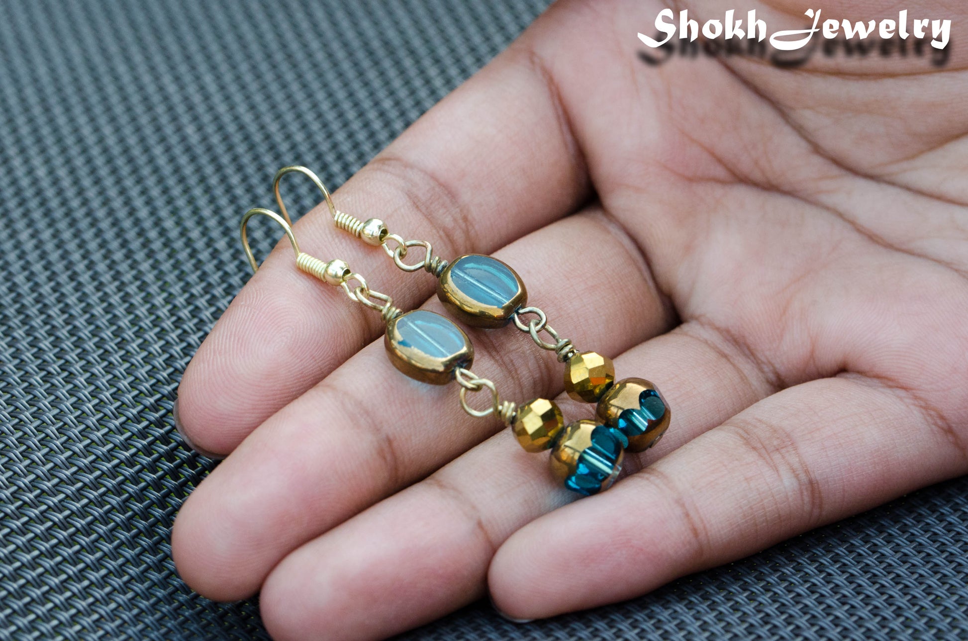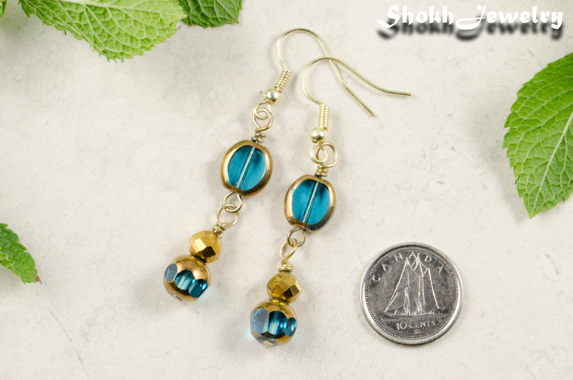Sparkly Gold and Patina Blue Glass Bead Earrings